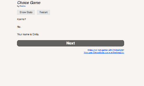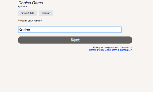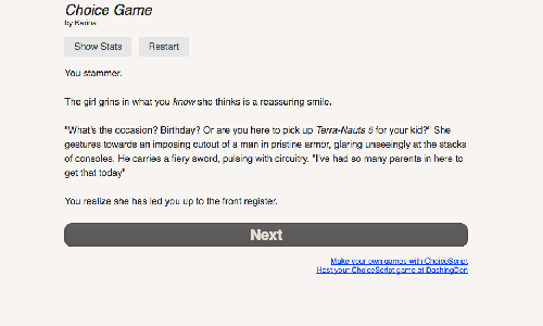 Choice Game follows a woman through her day as she grapples with the tension between her responsibilities and seeking pleasure. Choice Game explores the moments in life when we experience free will, when we don't, and escapism. This game was created as a part of a Narrative Studio class.