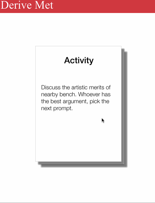 Get lost. Derive Met is a digital card game wherein players shuffle through a deck of prompts to see the Met through fresh eyes. Derive Met was created in a class centered on client work. In this case, our team worked with the Metropolitan Museum of Art's now defunct Media Lab.