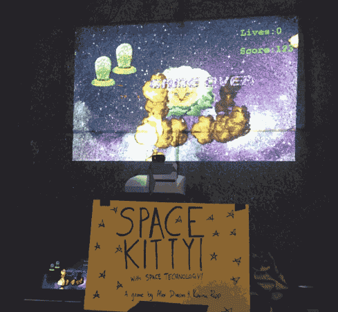 Space Kitty is an infi-player zap-em-up that uses your computer's webcam and any flashlight to shoot on screen dogliens. Space Kitty was shown at Come Out and Play's 2016 Night Games.